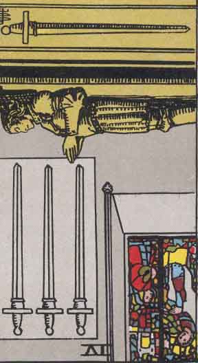 The Four of Swords reversed reinforces the continuing effort of the Nine of Wands. It’s time to keep the action going, keep forging ahead. However, the Four of Swords reversed can also indicate that this struggle might be wearing them down mentally. When you’ve been getting on with a project relentlessly, it can take a toll. Perhaps the querant hasn’t been taking care of themselves as well as they should be, putting all their energy into their mission and not so much on their own self-care. Now I’m thinking of Jack Nicholson typing “All work and no play makes Jack a dull boy” endlessly in The Shining, although there were extenuating circumstances there with a haunted hotel and all. Hopefully things haven’t got to such a dire point for your querant, but there is an indication that they haven’t taken the time to recharge their batteries, so to speak. It may feel like there is no time to focus on their own needs, but time needs to be made to keep an inner balance that will enable to maintain their ability to persevere without getting run down.