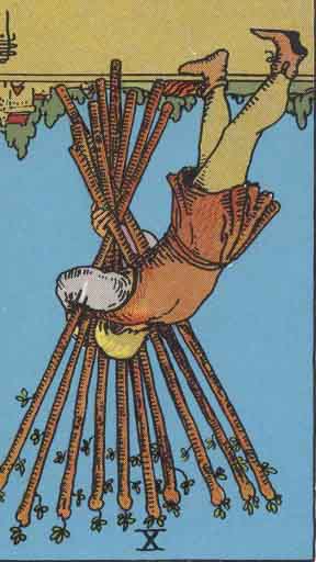 Quite often the Ten of Wands is not the most welcome card to see in a reading, and while it does mean there is a lot of effort and determination involved in carrying all those wands, it may very well be a load that the querant can bear successfully. But reversed, the querant is struggling under the weight of this load. It’s become too much and it is wearing them down.